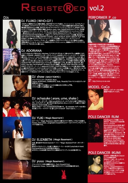 DJs: DJ FUJIKO (WHO-G!?), DJ ADORIANA, DJ YUKI, DJ ELIZABETH,